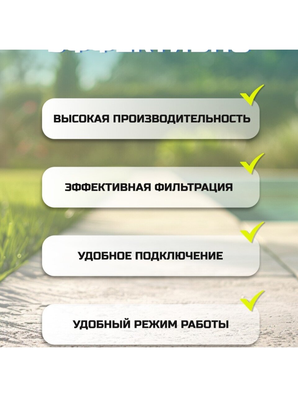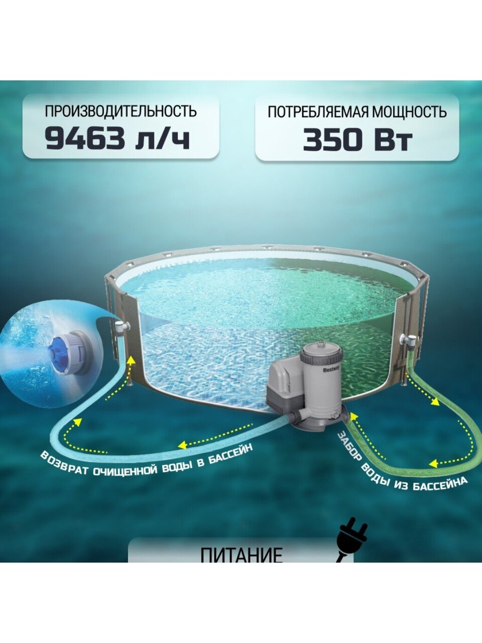 - Универсальность: подходит для бассейнов объемом от 1100 до 62000 литров.