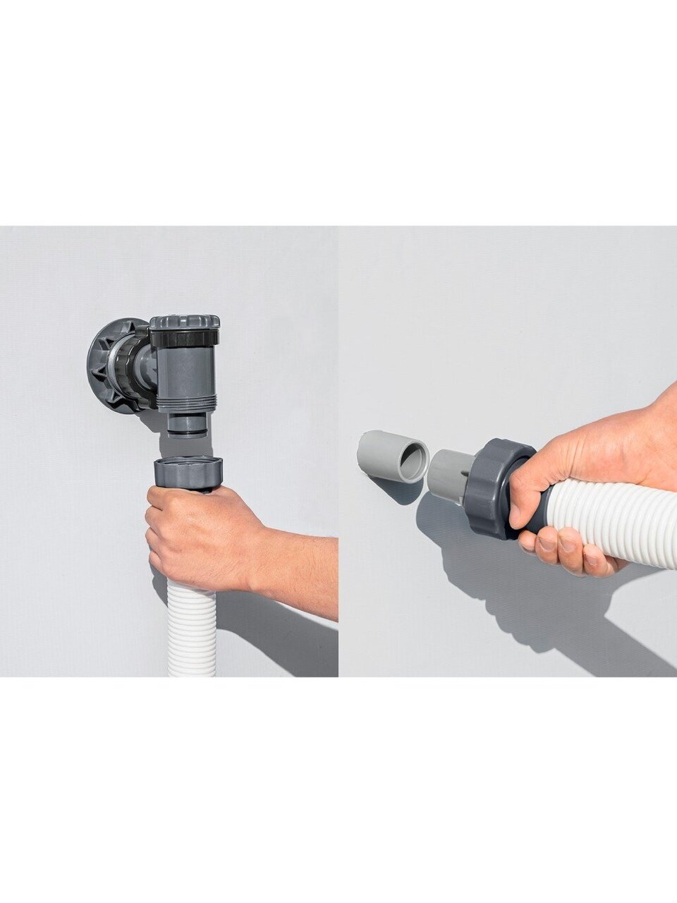 Круглая насадка с небольшим сетчатым отверстием посередине идет на отдачу воды в бассейн. На забор воды идет насадка с большим диаметром сетки, имеющая форму восьмигранника.