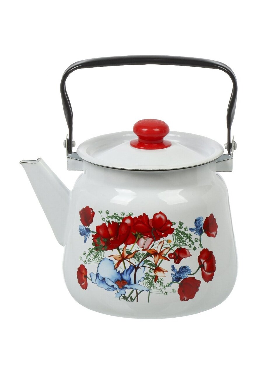 Чайник из стали с эмалированным покрытием 3,5 л «Цветы красные» — стильное решение для дома и дачи. Безопасная кнопка, яркий декор, подходит для посудомоечной машины.
