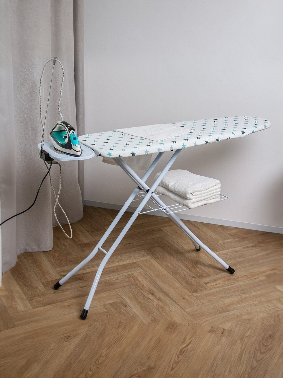 Большая высота до 90 см и два положения регулировки делают доску удобной для пользователей любого роста. Специальная подставка для утюга и кронштейн для провода позволяют организовать рабочее пространство максимально эргономично. Полка для белья экономит место и помогает держать под рукой уже выглаженные вещи. Благодаря складной конструкции доска легко хранится и транспортируется, что особенно актуально для небольших квартир и дачных домов.