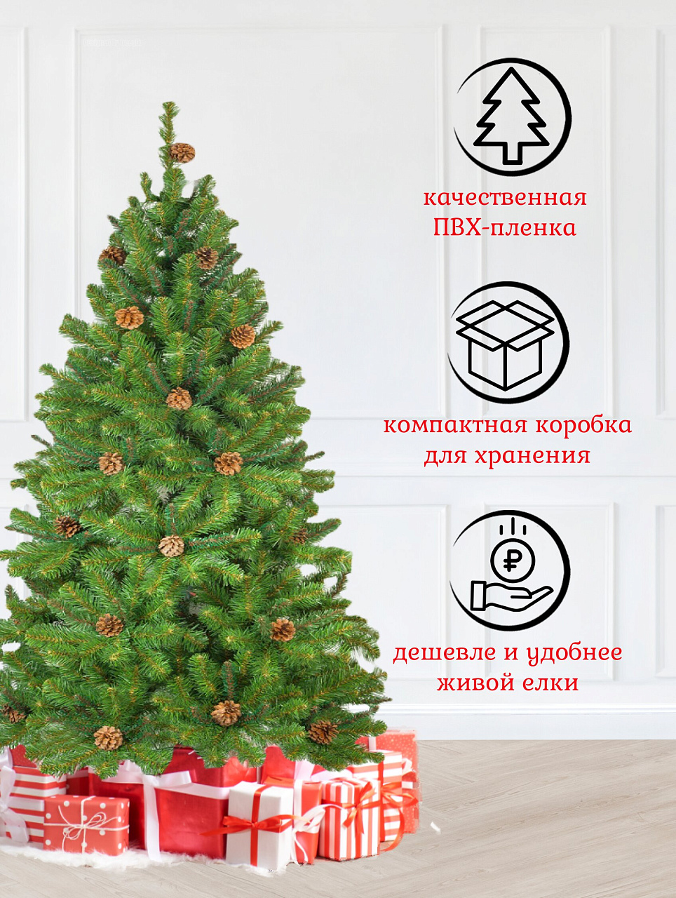 Если вы ищете, какую елку выбрать для подарка или как украсить дом к Новому году, обратите внимание на эту модель — она гармонично смотрится в любой комнате, а наличие шишек добавляет уюта и праздничности. По сравнению с аналогами на металлической подставке, конструкция более устойчива и прослужит не один сезон.