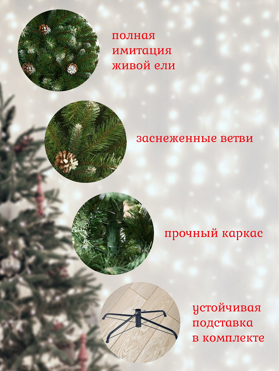 - Реалистичный заснеженный эффект и декор шишками — создаёт атмосферу зимней сказки без осыпания и запаха пластика