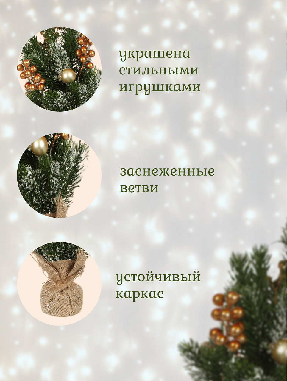Настольная елка 35 см с литой хвоей и декором "Золотые ягоды и шишки" — компактное решение для уютного новогоднего настроения дома или в офисе. Без лишних хлопот и осыпания.