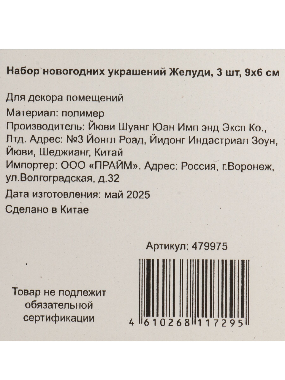 Вы можете приобрести «Набор елочных украшений Желуди, 3 шт, кофе, шампань, 9х6 см, пластик, SYQD1- 0124213» и другие товары в нашем интернет-магазине в Ельце по низким ценам и с бесплатным самовывозом.