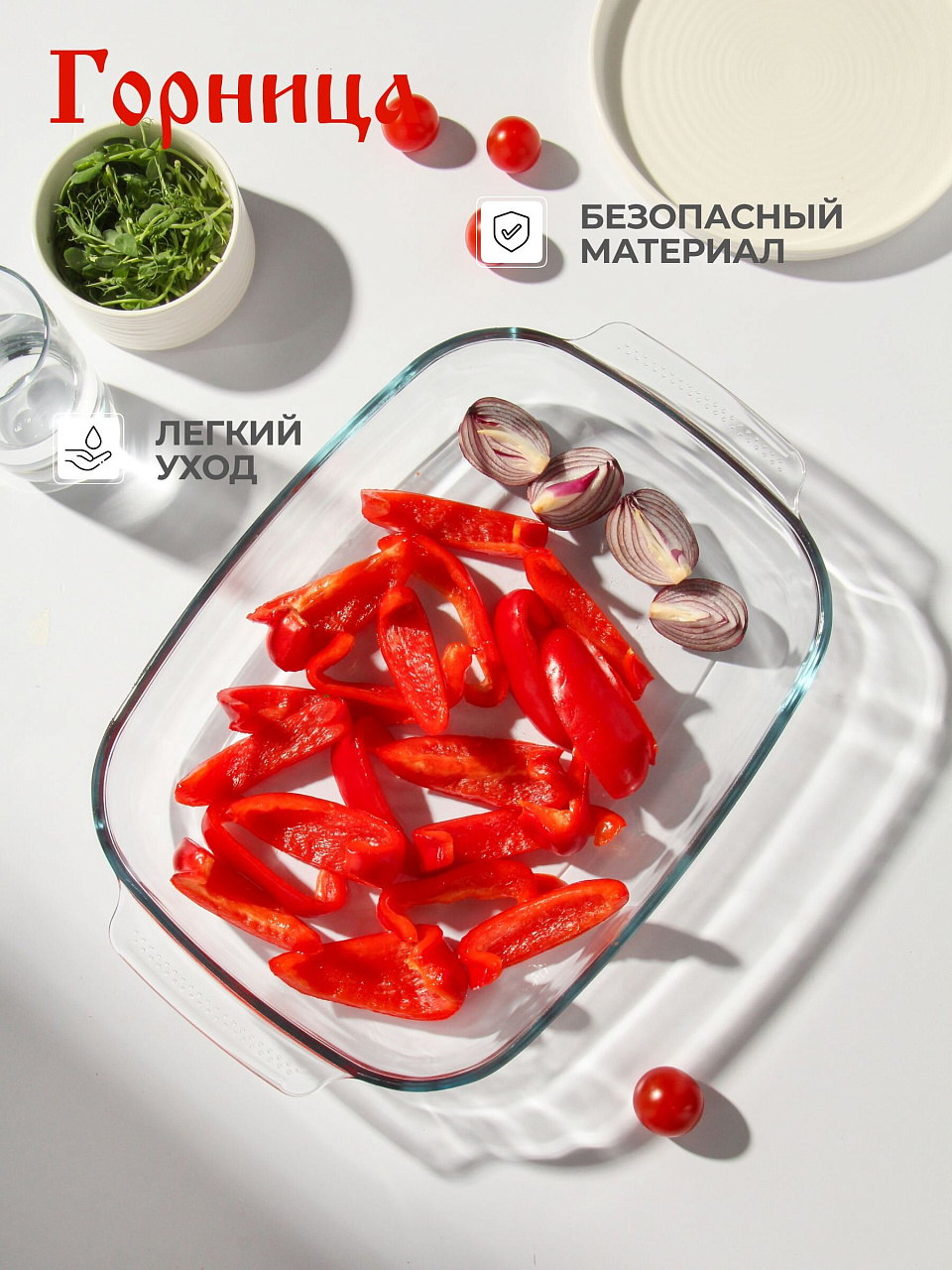 Прямоугольная форма для запекания из жаропрочного стекла 3,7 л Горница — идеальный выбор для семьи: удобно готовить мясо, рыбу и пироги, легко мыть, подходит для микроволновки и духовки.