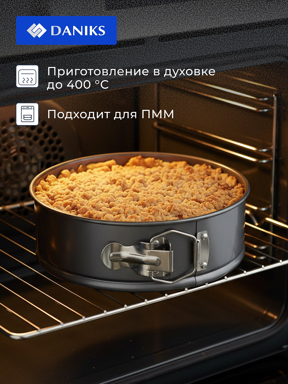 В отличие от обычных форм, в комплекте Daniks используются рифленое и перфорированное дно, съемное основание, универсальные размеры (34×24×4.5, 18×6.8, 23.2×22.2×5 см) и прочная сталь с антипригарным покрытием.