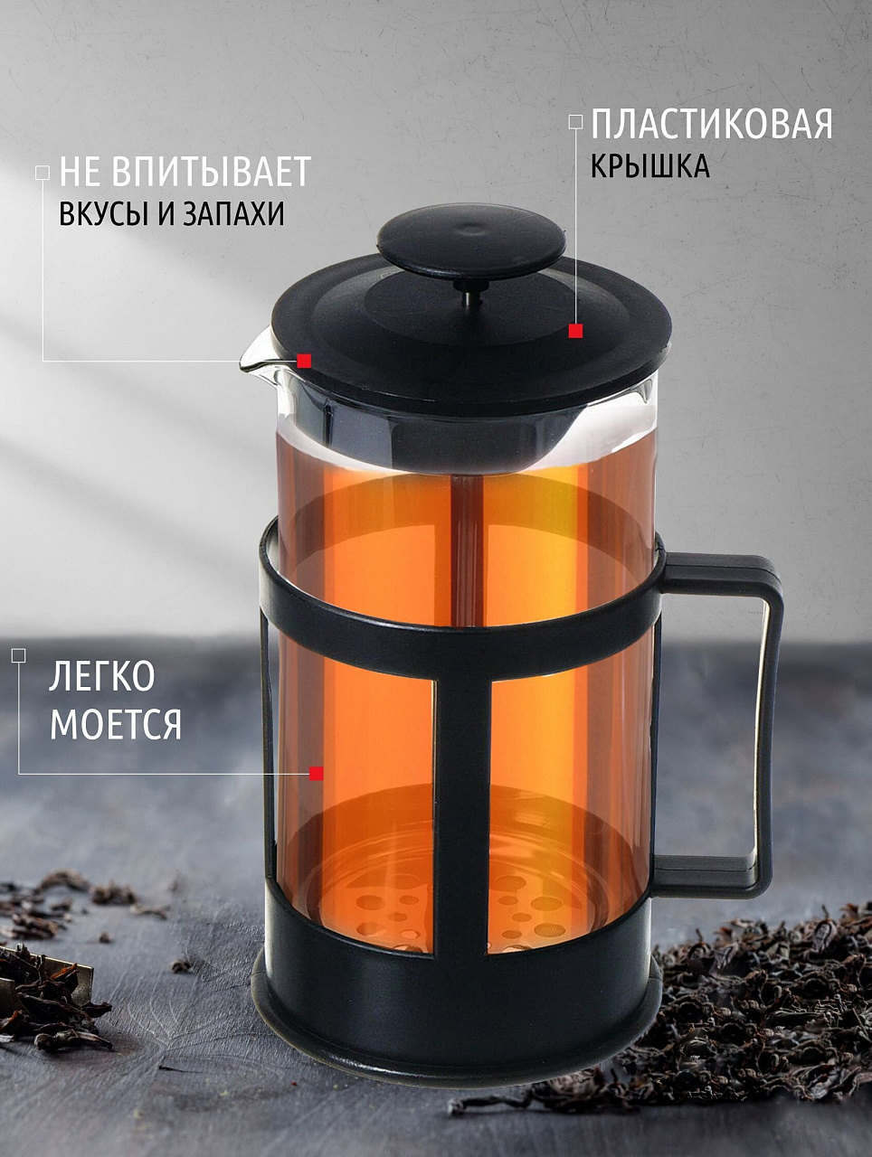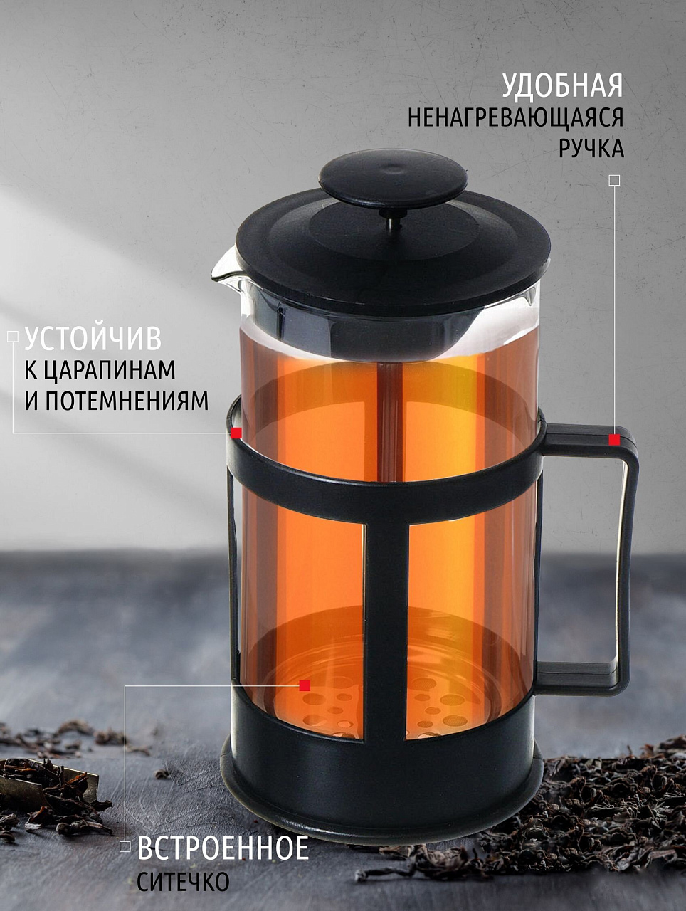 Френч-пресс 1 л, стекло, пластик, Daniks, черный — идеальный выбор для ценителей свежезаваренного чая и стильных аксессуаров для кухни. Современный дизайн в лаконичном черном цвете гармонично впишется в любой интерьер, а сочетание прочного стекла и высококачественного пластика гарантирует долговечность и легкость ухода. Благодаря объему 1 литр удобно готовить чай сразу для всей семьи или гостей, наслаждаясь насыщенным вкусом и ароматом любимого напитка.