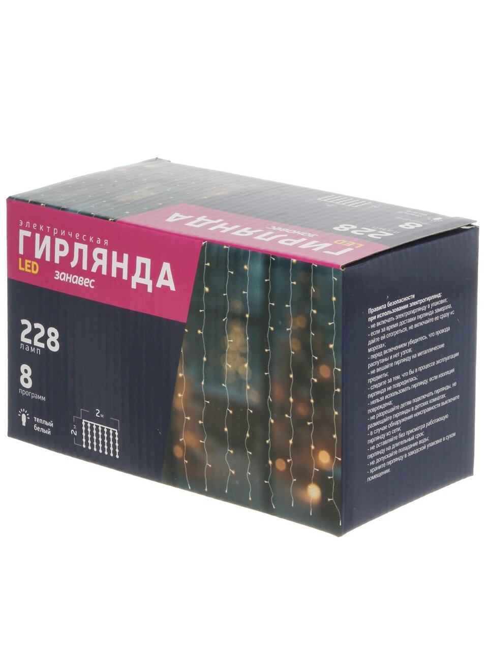 Гирлянда-занавес 228 LED, 2х2 м: теплый свет, 8 режимов, пульт. Эффектное оформление дома, дачи или праздника — легко, быстро, безопасно.