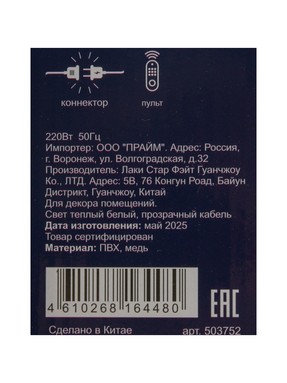 В гирлянде 8 световых режимов: постоянное свечение, волны, мерцание, комбинированные эффекты. Переключение — с помощью пульта дистанционного управления.