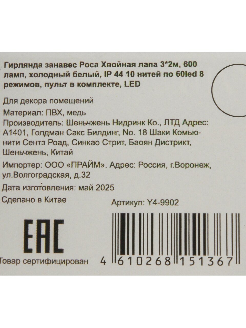 Размер занавеса — 3 метра по ширине и 2 метра по высоте, 10 нитей по 60 светодиодов, всего 600 LED-ламп. Хвойные лапы придают объём и реалистичный вид.