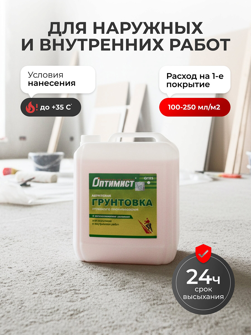 - Условия нанесения: Температура воздуха и обрабатываемой поверхности - от +5°С до +35°С.