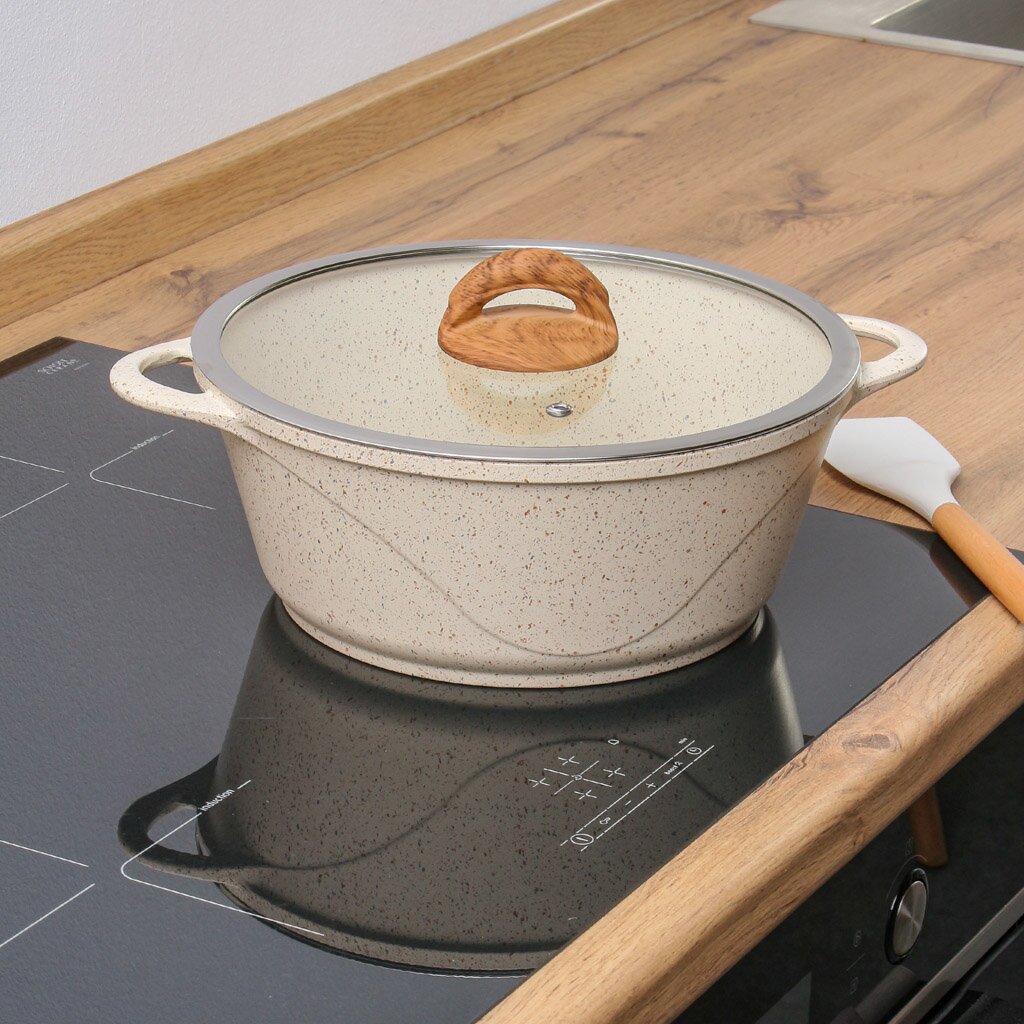 Мраморное покрытие предотвращает пригорание пищи, позволяет готовить с минимальным количеством масла и облегчает мытье — кастрюлю можно помещать в посудомоечную машину.