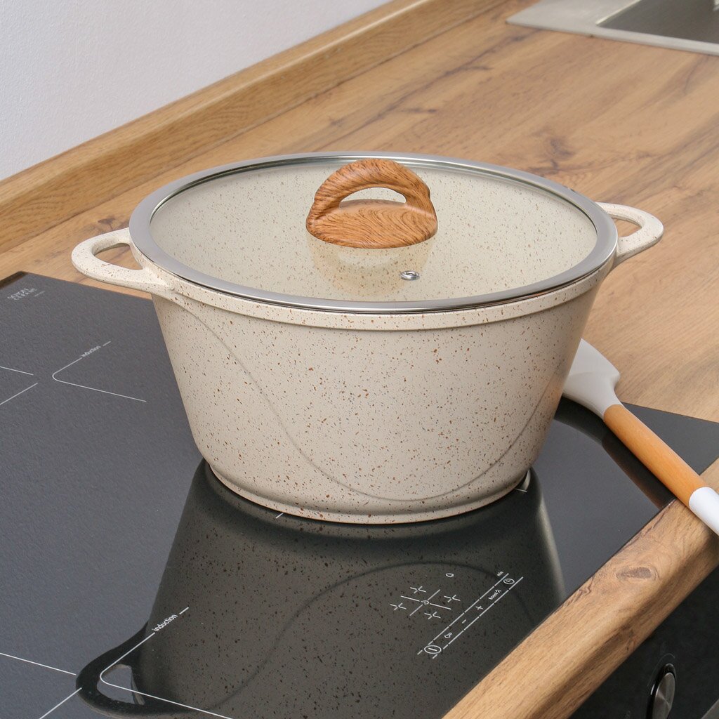 Как использовать кастрюлю с антипригарным покрытием? Не используйте металлические аксессуары, избегайте резких перепадов температур — это продлит срок службы. Благодаря объему 5 литров вы сможете готовить большие порции для всей семьи или компании друзей.