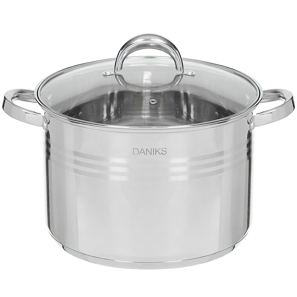 Кастрюля из нержавеющей стали 12 л Daniks: для индукции, с мерной шкалой и стеклянной крышкой — оптимальное решение для кухни, дачи, общепита.