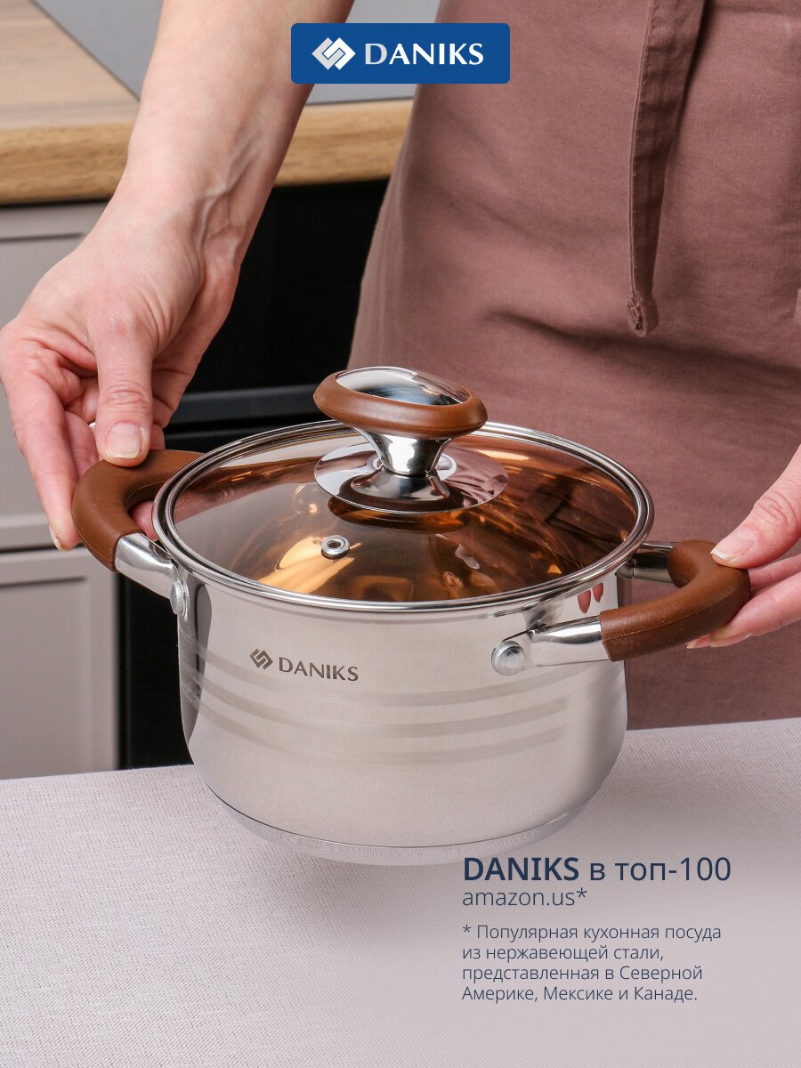 Кастрюля из нержавеющей стали 2 л Daniks Веллингтон с капсульным дном и стеклянной крышкой — идеальный выбор для быстрой готовки на индукции, дома и на даче.