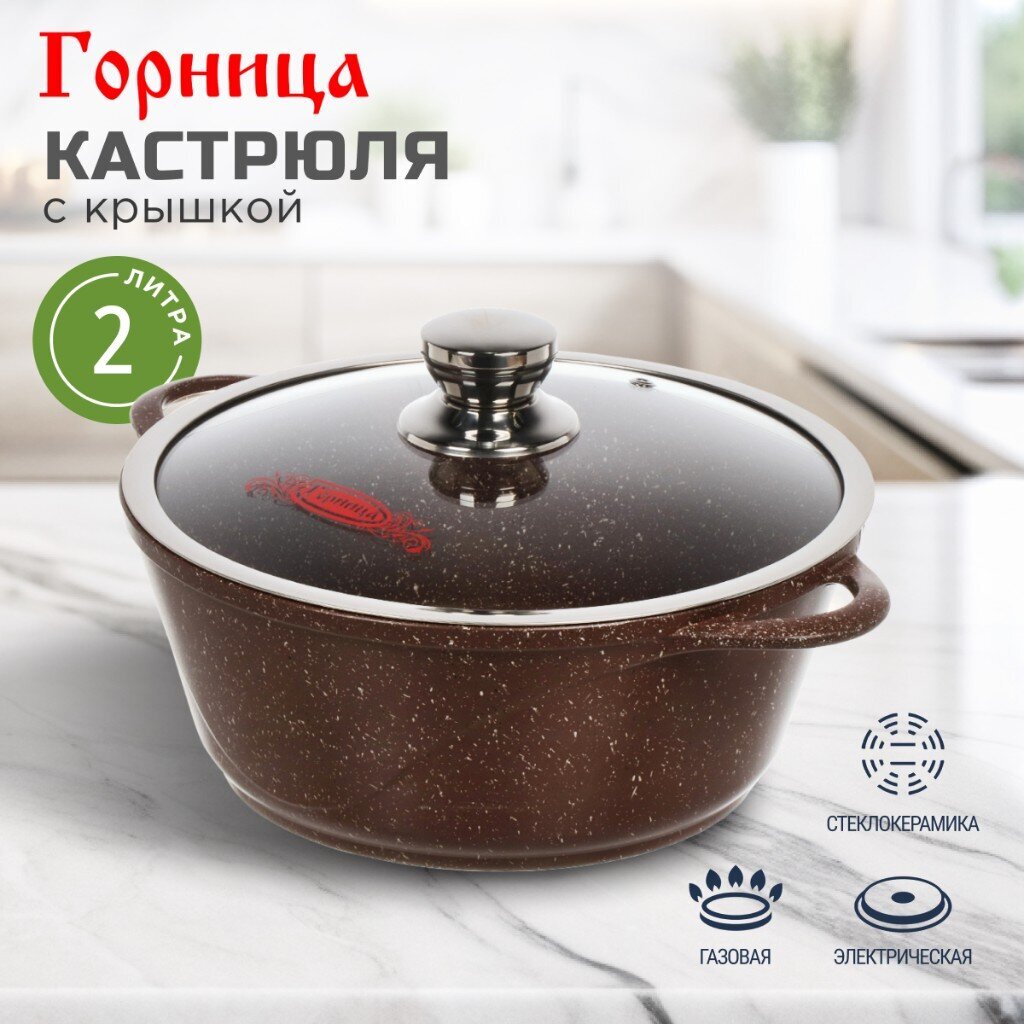 Кастрюля 2 л Горница Шоколад — идеальный выбор для дома и дачи: антипригарное мраморное покрытие, стеклянная крышка, подходит для супа, плова, пюре.