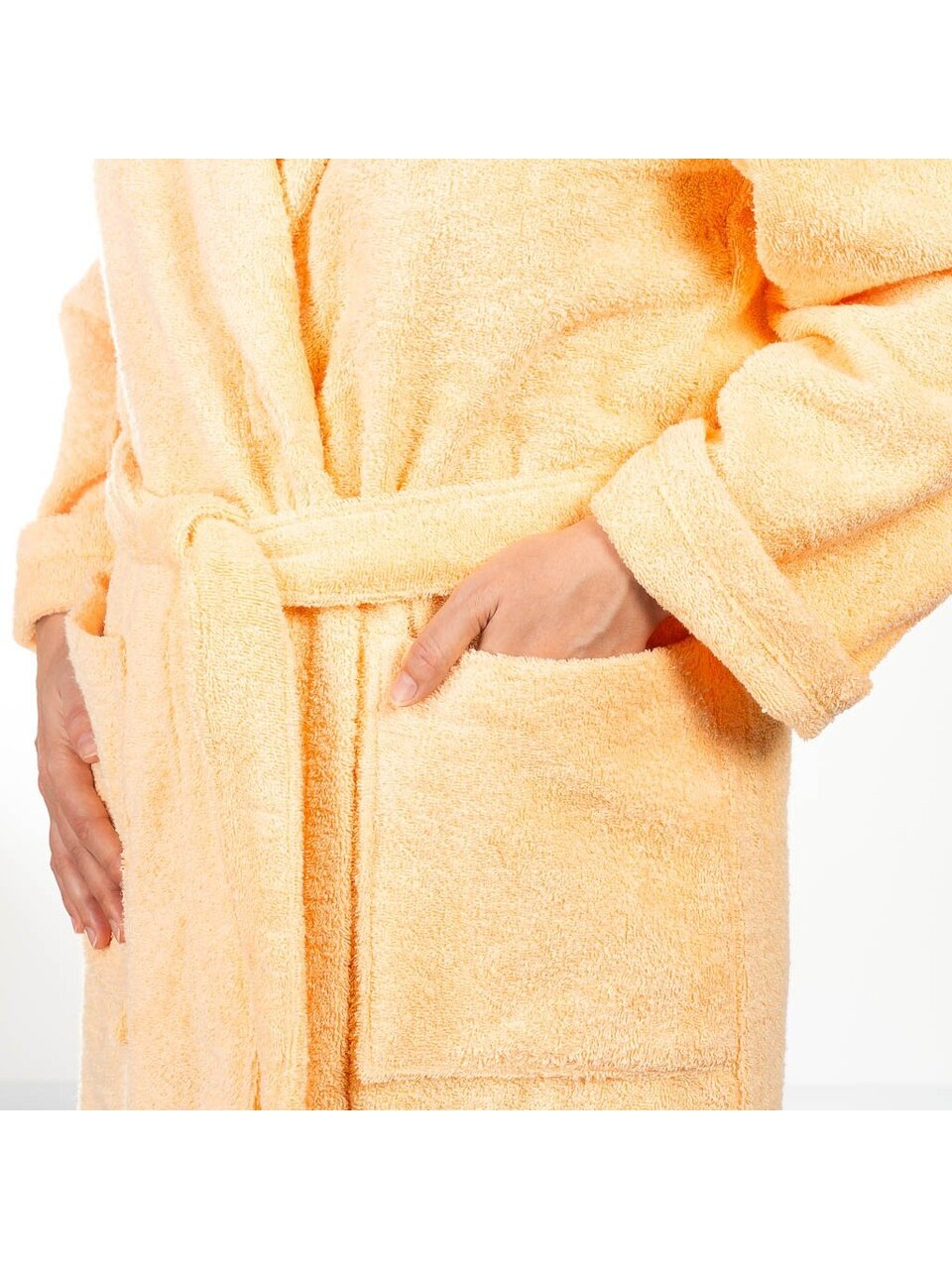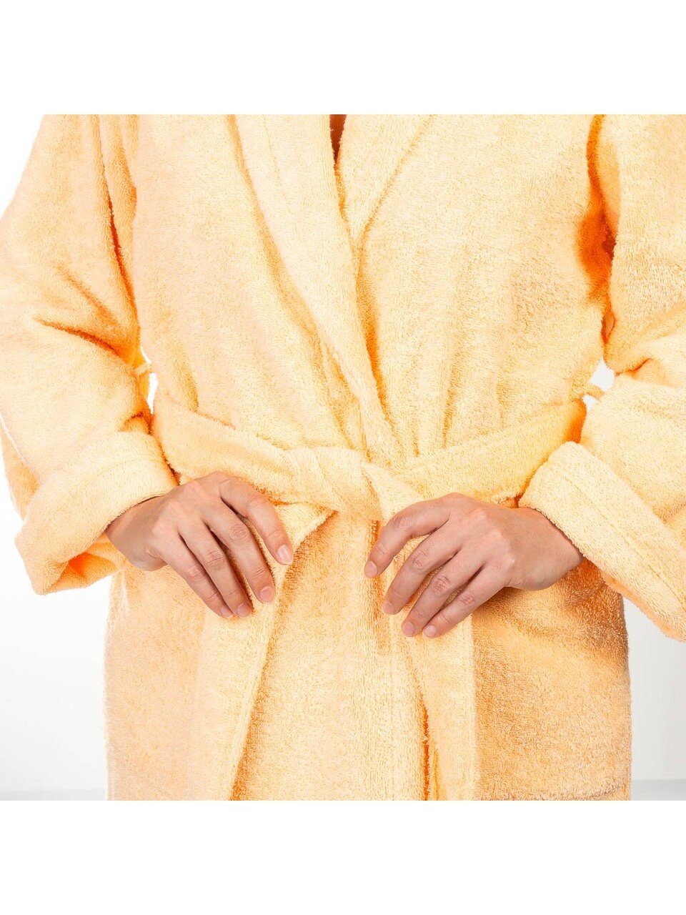 - стиль и универсальность: персиковый оттенок и отсутствие капюшона делают этот халат стильным и подходящим для любого времени года;