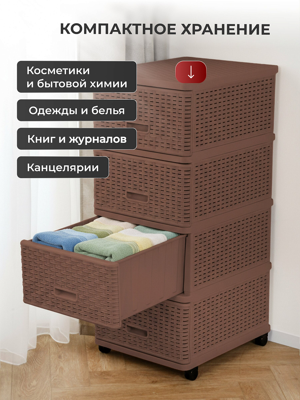 Комод 4 ящика Дюна 40х50х98 см — практичное и стильное решение для хранения вещей в любом современном интерьере. Благодаря компактным размерам и узкой форме комод идеально впишется даже в ограниченное пространство, позволяя организовать порядок в доме или на даче. Коричневый цвет и плетеная фактура фасадов придают изделию актуальный внешний вид, который легко сочетается с различными стилями оформления помещений. Прочный пластик обеспечивает долгий срок службы, устойчив к влаге и легко очищается, что особенно важно для ежедневного использования.