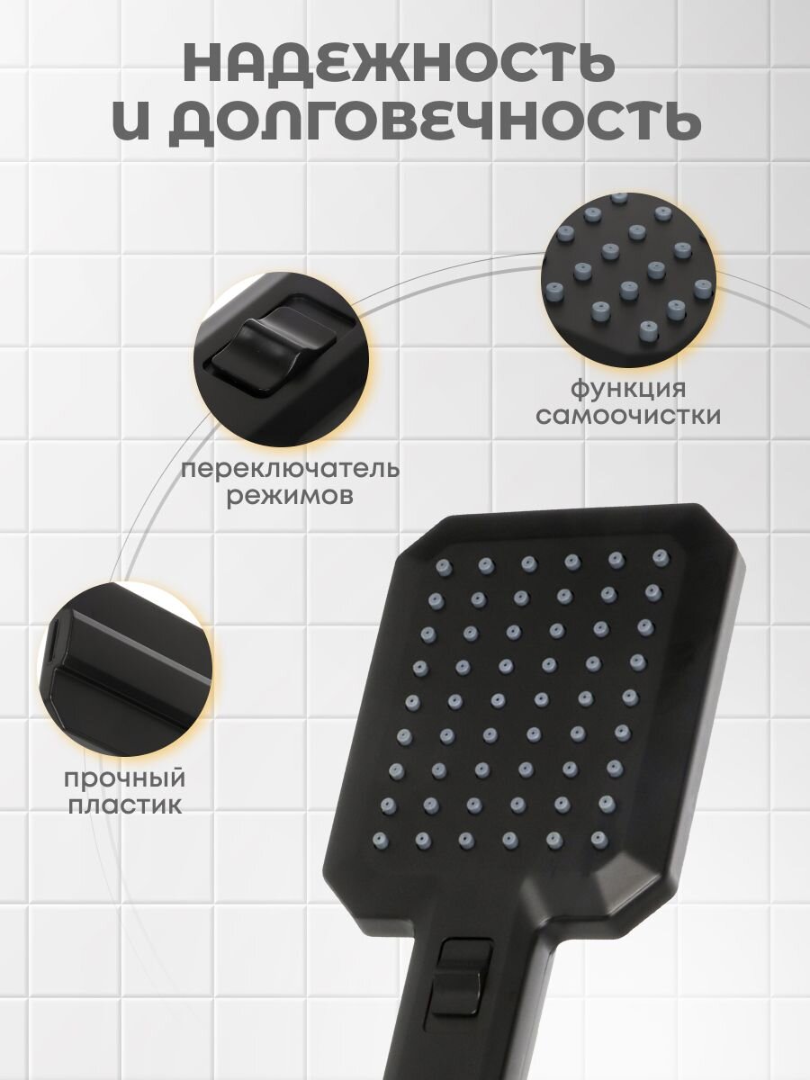 Лейка для душа выдаёт узконаправленный напор из отверстий, благодаря чему не происходит излишнего разбрызгивания, предотвращая распространение капель воды на пол и окружающие предметы, что поможет сохранить ванную комнату сухой и чистой.