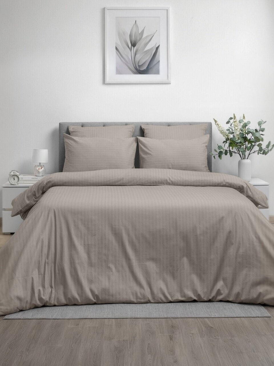 В наборе евро-простыня 220х240 см и пододеяльник 200х220 см, что соответствует стандарту для больших двуспальных кроватей.