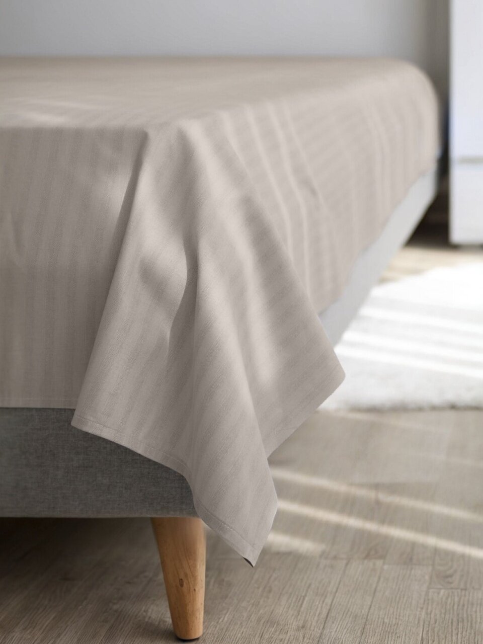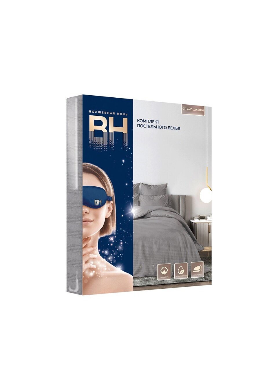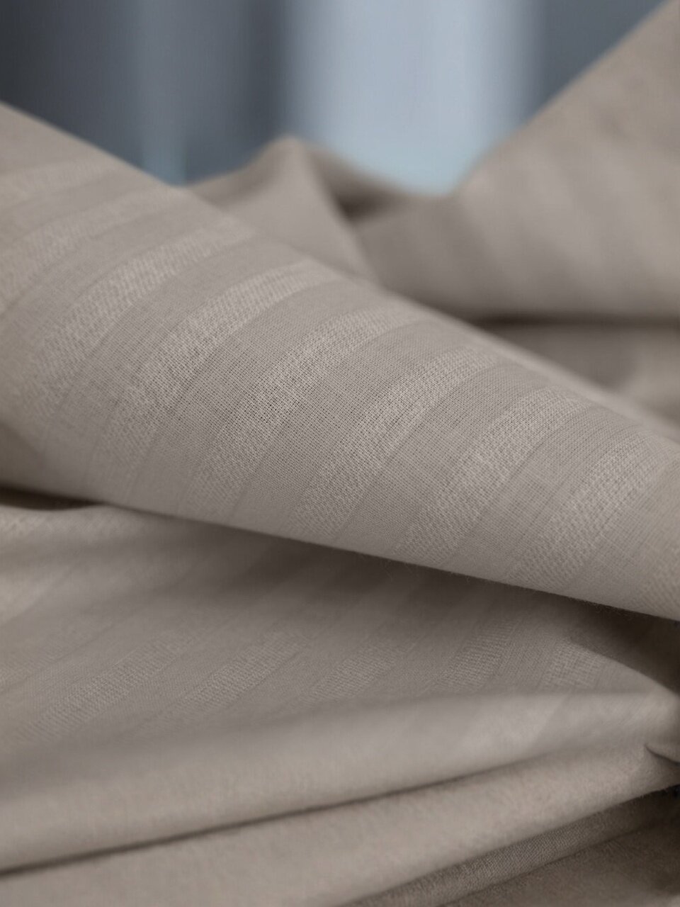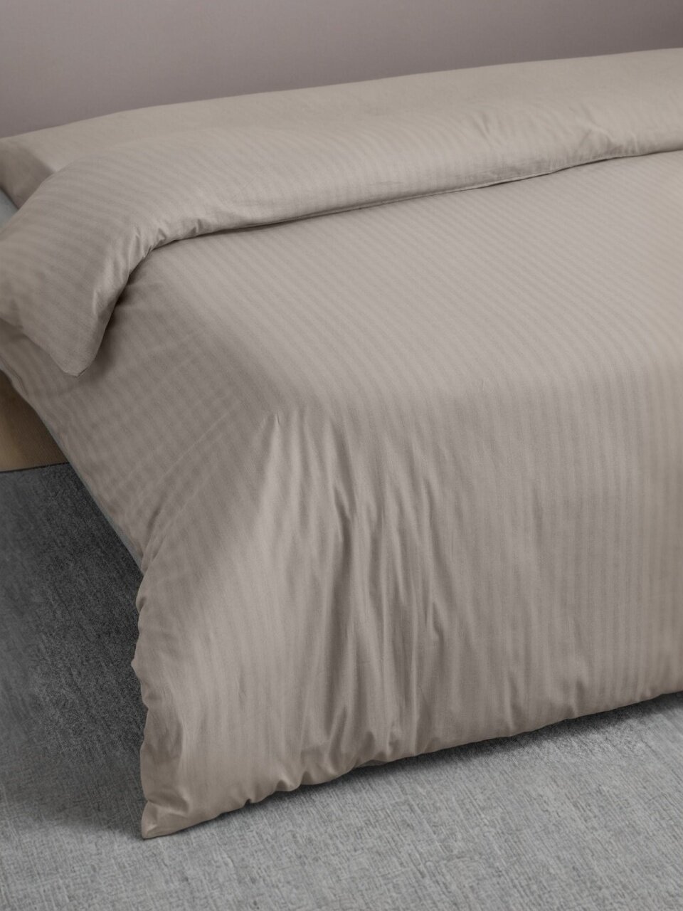 Комплект выполнен из страйп-ранфорса (100% хлопок), рекомендуется стирка при 40°C, не содержит синтетики и подходит для чувствительной кожи.