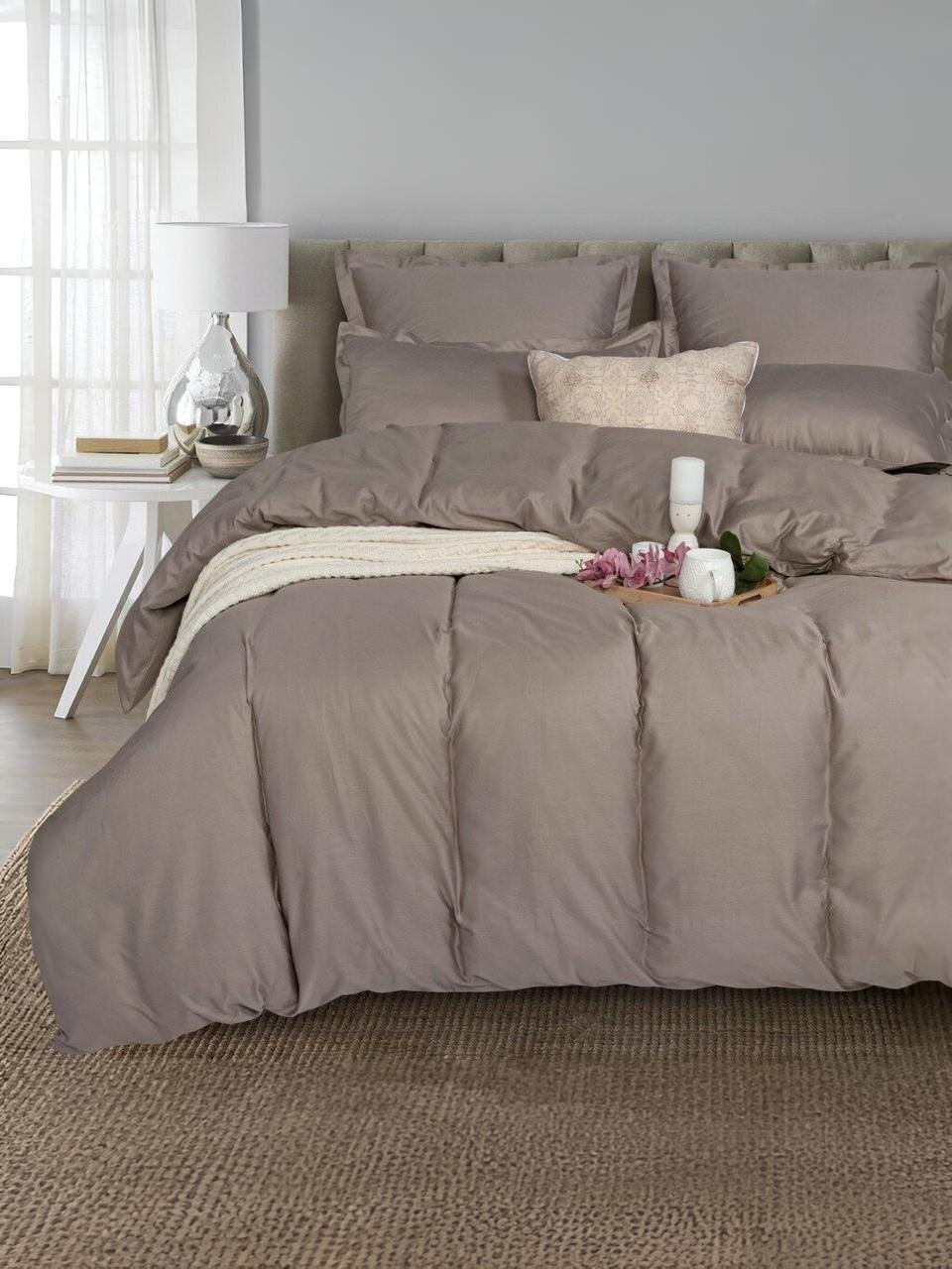 Как использовать комплект? Просто застелите кровать: простыня на резинке облегает матрас, пододеяльник 200х215 см подходит для стандартных евро-одеял, а наволочки 70х70 см — для классических подушек. Подходит ли для подарка? Да, комплект поставляется в подарочной упаковке и смотрится статусно благодаря однотонному дизайну в цвете бронзы.