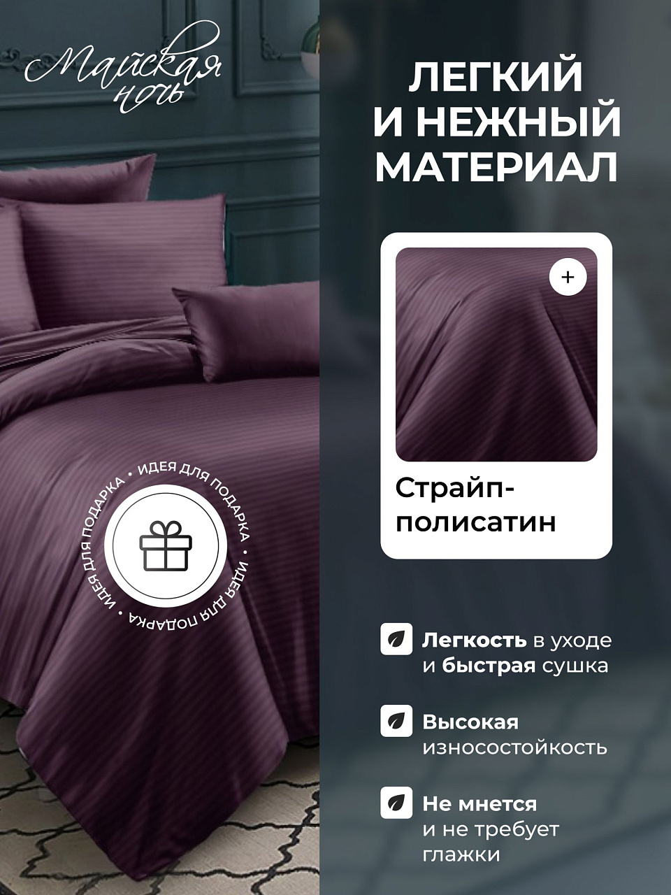 Часто спрашивают, чем страйп-полисатин отличается от обычного сатина или хлопка: он менее подвержен сминанию, не требует глажки и дольше сохраняет форму. Если вы ищете, какое постельное белье лучше выбрать для дачи или временного жилья, этот комплект — отличное решение благодаря легкости и практичности. Для подарка предусмотрена стильная упаковка, а универсальный фиолетовый цвет гармонично впишется в любой интерьер.