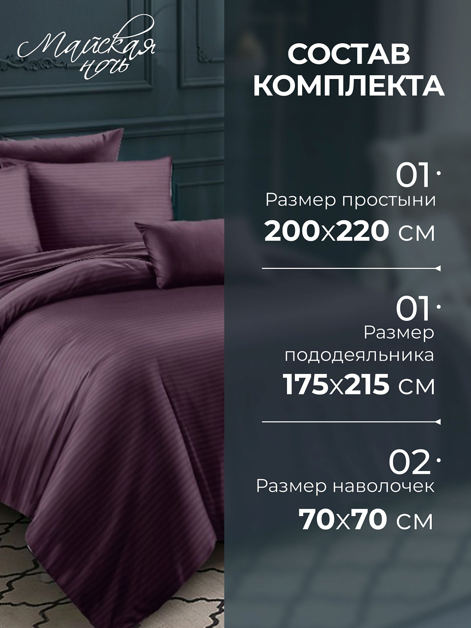 Двуспальное постельное белье «Майская ночь» выполнено из страйп-полисатина — материала с шелковистой текстурой и высокой износостойкостью. Такой состав (100% полиэстер) обеспечивает простоту ухода, быстро сохнет и сохраняет насыщенность цвета даже после многократных стирок при 40 градусах. Комплект включает простыню 200х220 см, пододеяльник 175х215 см и две наволочки 70х70 см — оптимальный выбор для семейной кровати или просторного дивана.