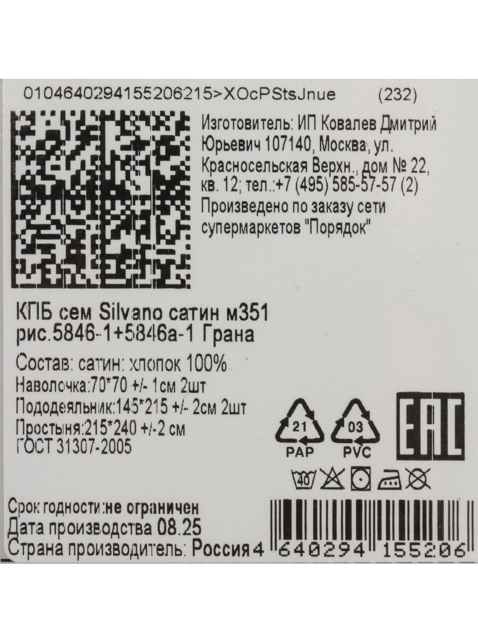 Вы можете приобрести «Постельное белье семейное, простыня 240х260 см, 2 наволочки 70х70 см, 2 пододеяльника 145х215 см, Silvano, сатин, Грана» и другие товары в нашем интернет-магазине в Коврове по низким ценам и с бесплатным самовывозом.