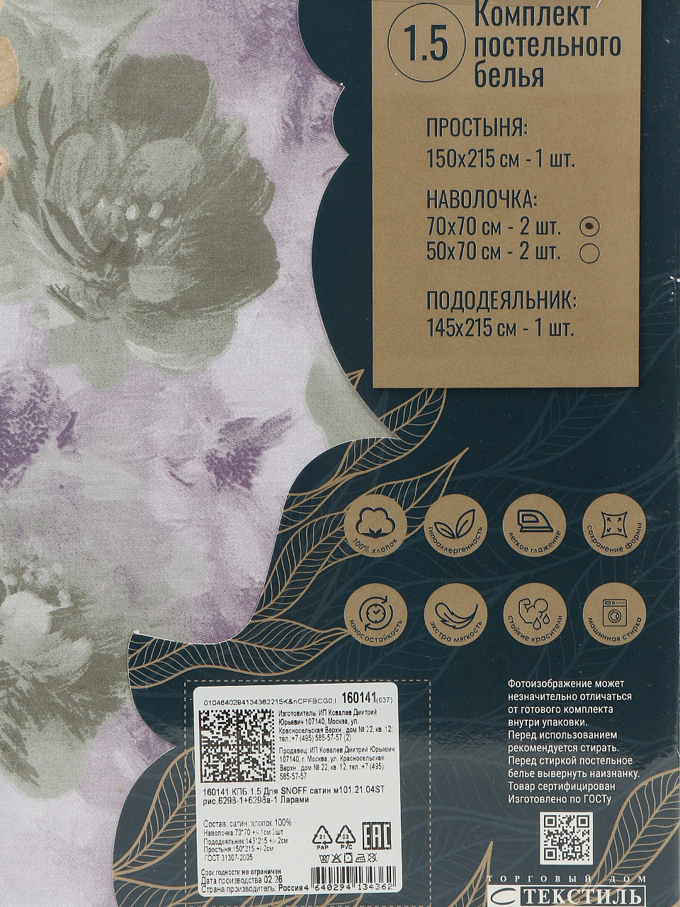 - Стандартная комплектация: пододеяльник 145х215 см и простыня 150х215 см идеально подходят для большинства российских односпальных и полуторных кроватей.