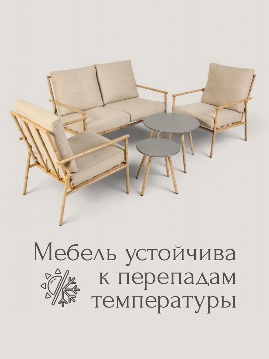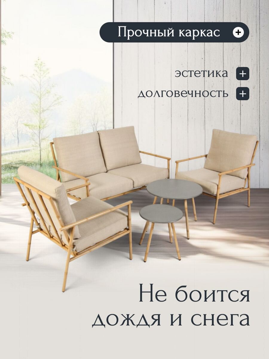 Мебель садовая Валлета — идеальное решение для создания стильной и уютной атмосферы на даче, в саду или дома. Комплект гармонично сочетает в себе современный дизайн, комфорт и практичность, что делает его отличным выбором для семейного отдыха, встреч с друзьями и приятных вечеров на свежем воздухе. Бежевый цвет мебели придаёт пространству лёгкость и визуальное тепло, а подушки в комплекте обеспечивают дополнительный уют и комфорт во время отдыха. Комплект включает два стола с круглыми столешницами разных размеров, кресло и двухместное кресло, что позволяет удобно разместить до четырёх персон.