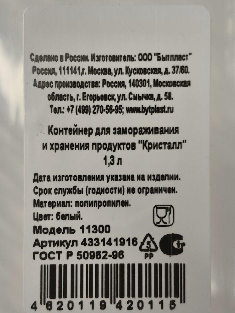 Вы можете приобрести «Контейнер пищевой пластик, 1.3 л, 18х12.5х8 см, белый, прямоугольный, Бытпласт, Кристалл, 433141916» и другие товары в нашем интернет-магазине в Ярославле по низким ценам и с бесплатным самовывозом.
