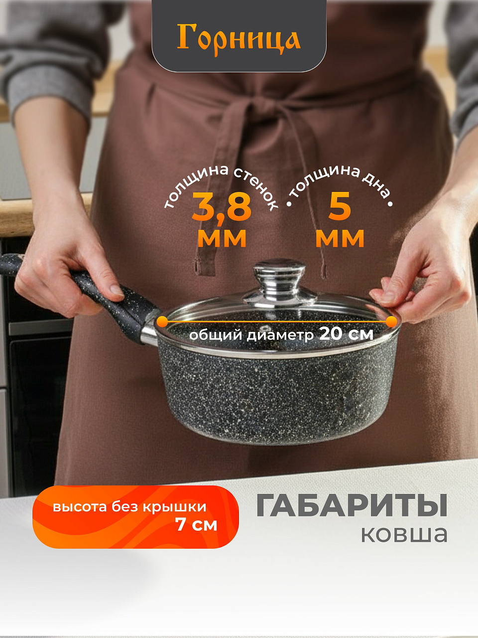 Ковш Горница Гранит 2 л с антипригарным покрытием, стеклянной крышкой и съемной бакелитовой ручкой — удобно, безопасно, долговечно. Идеальный выбор для дома и дачи.