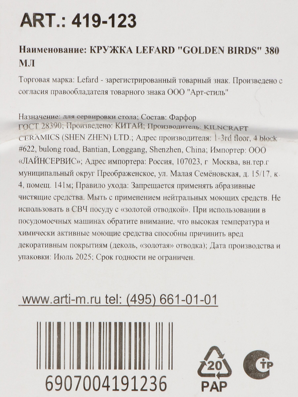 Вы можете приобрести «Кружка фарфор, 380 мл, Golden Birds, Lefard, 419-123» и другие товары в нашем интернет-магазине в Белгороде по низким ценам и с бесплатным самовывозом.