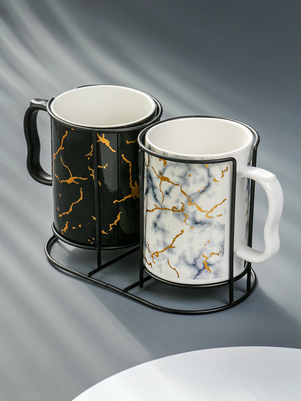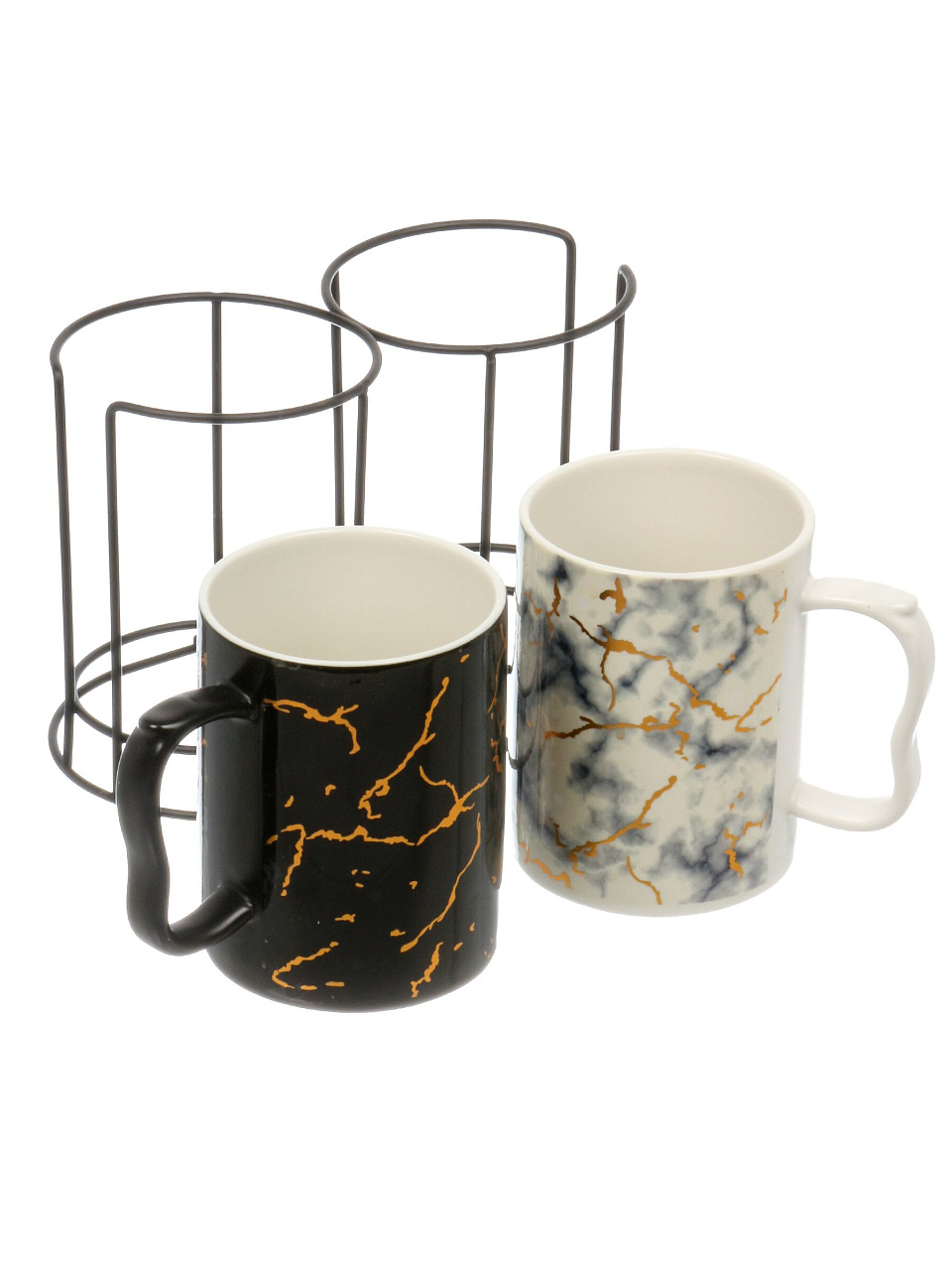 Стильный чайный набор из керамики на металлической подставке: 2 кружки по 400 мл, мраморный дизайн, идеальный подарок и практичное решение для современной кухни.