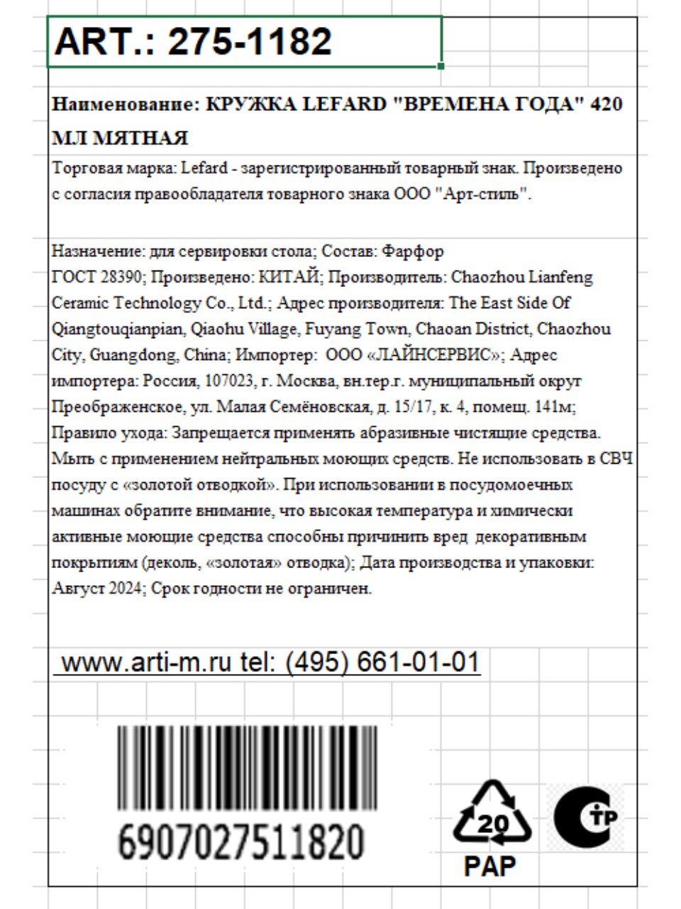 Вы можете приобрести «Кружка фарфор, 420 мл, Времена года, Lefard, мятная» и другие товары в нашем интернет-магазине в Нижнем Новгороде по низким ценам и с бесплатным самовывозом.