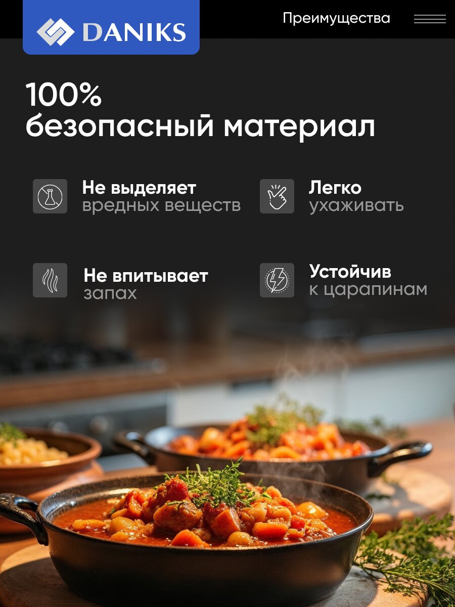 Эргономичные формы делают посуду удобной и практичной в процессе эксплуатации. Качественные материалы и современные технологии способствуют долгому сроку службы изделия. А соответствие всем экологическим нормам характеризует изделия торговой марки Daniks безопасными для потребителя.