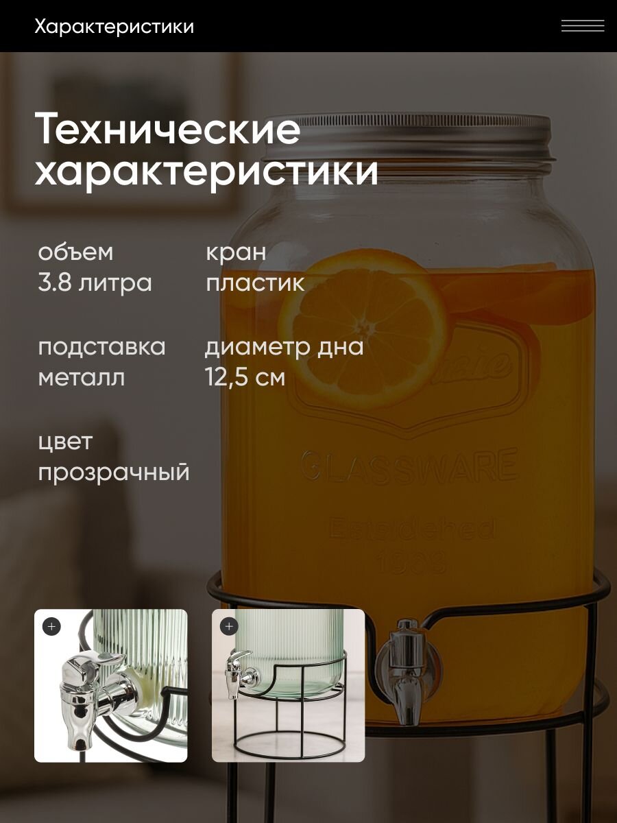 Изящный стеклянный диспенсер для напитков превратит Вашу сервировку в настоящее произведение искусства. Оптимальный объем 3,8 литра позволит подать к столу достаточное количество сока или лимонада даже для большой компании.