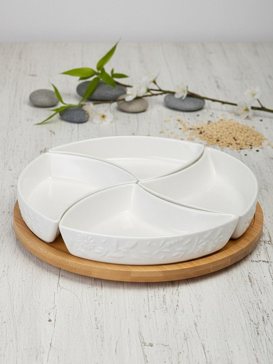 - Практичные параметры: 4 секции, диаметр 25 см, долговечный фарфор и натуральное дерево, легко мыть.