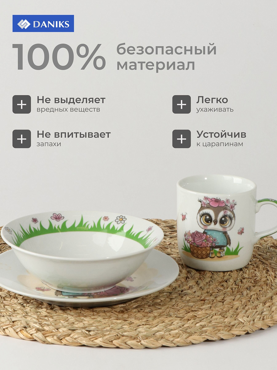 В комплект входят: тарелка диаметром 18 см, салатник 15 см объёмом 350 мл и кружка на 230 мл. Такой набор станет незаменимым помощником для сервировки завтраков, обедов и полдников, а также отлично подойдёт для детских праздников и тематических вечеринок.