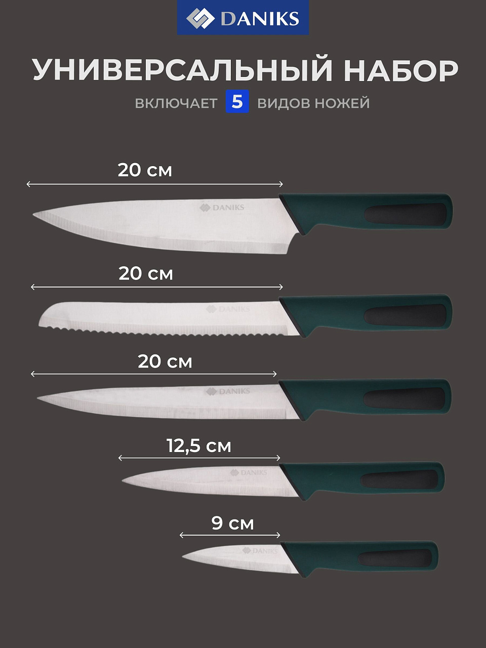 Daniks Emerald – это выбор для тех, кто ценит качество, удобство и современный внешний вид кухонных аксессуаров. Благодаря возможности мыть ножи в посудомоечной машине уход за комплектом становится максимально простым, а прочные материалы гарантируют сохранение внешнего вида и функциональности на долгие годы. Оптимальная длина лезвий (от 9 до 20 см) позволяет легко справляться с любыми задачами – от нарезки овощей до разделки мяса и хлеба. Яркий зелёный цвет поднимает настроение и делает процесс приготовления пищи ещё приятнее.