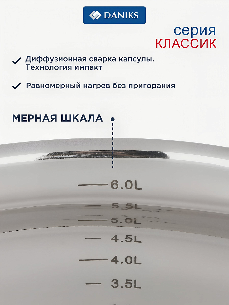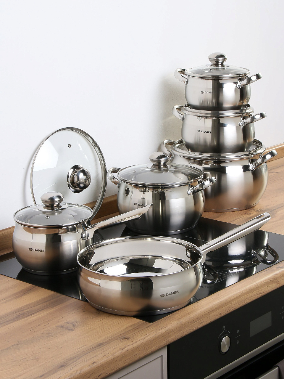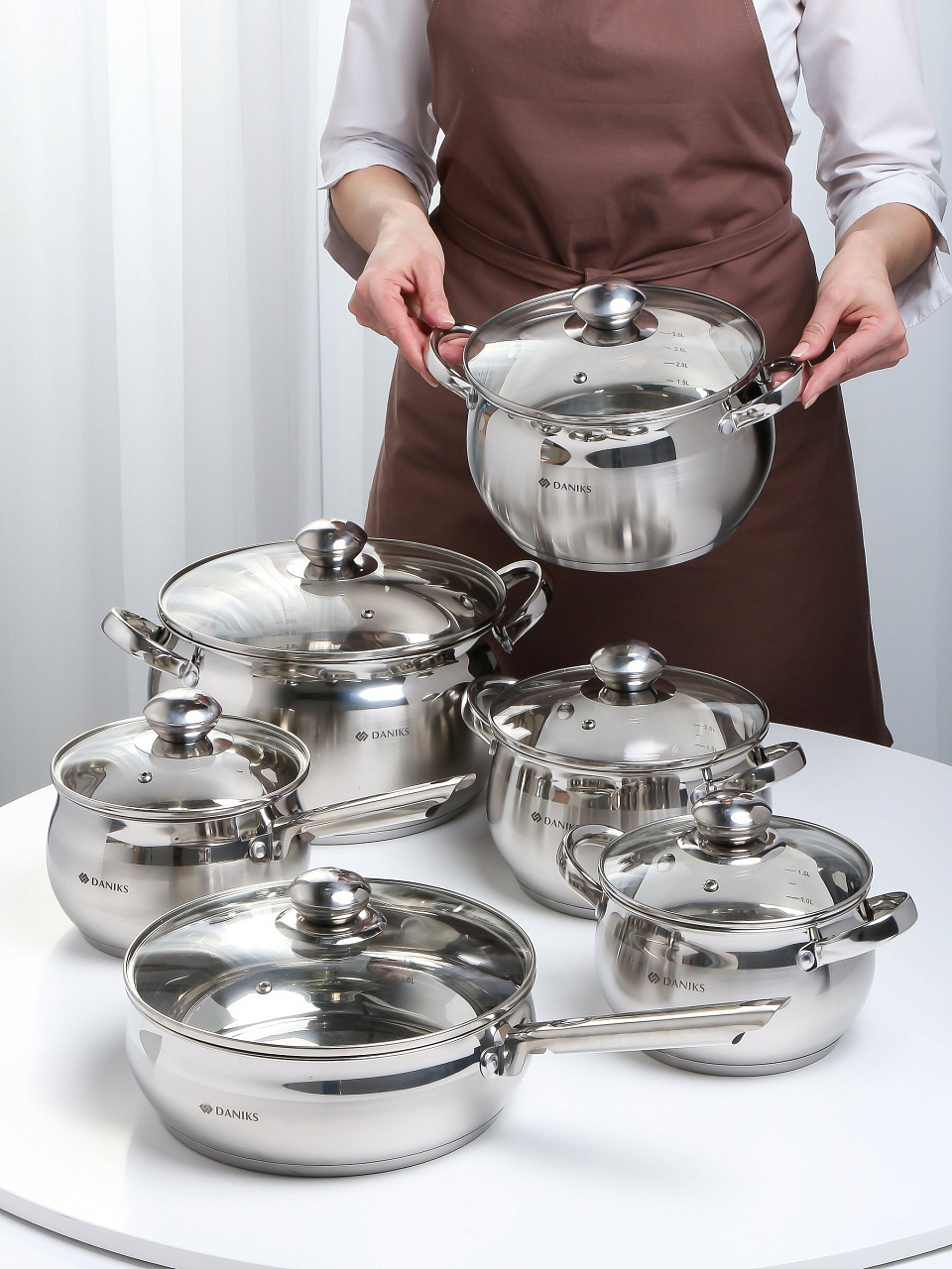 Набор посуды из нержавеющей стали Daniks Классика 12 предметов: универсальное решение для кухни, дачи и подарка. Готовьте супы, каши и пюре на любой плите — долговечно и выгодно.