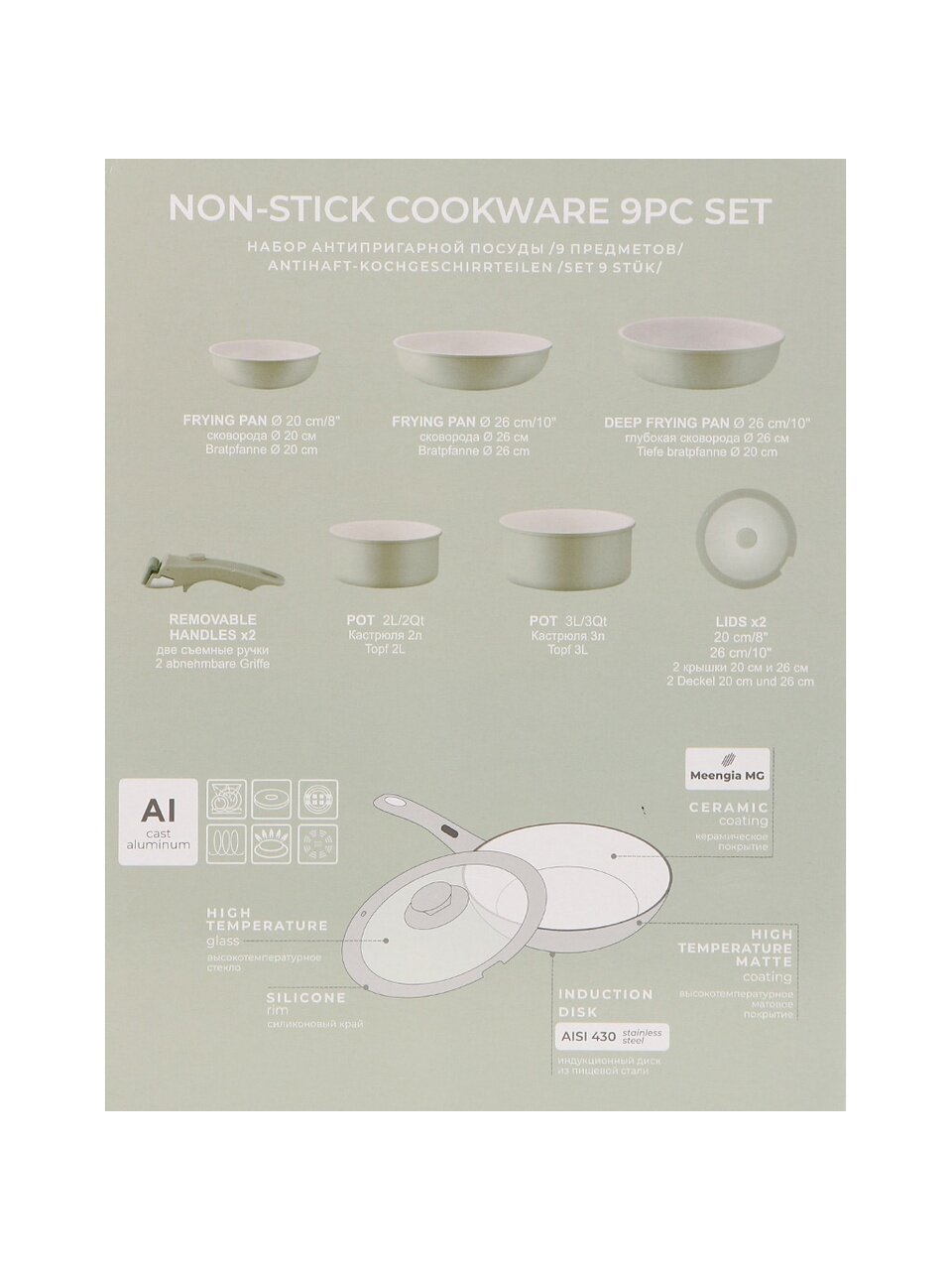 - Толстостенный литой алюминий 2,5 мм, керамическое антипригарное покрытие, жаропрочная внешняя отделка и индукционный диск из стали 430 обеспечивают долговечность и универсальность.