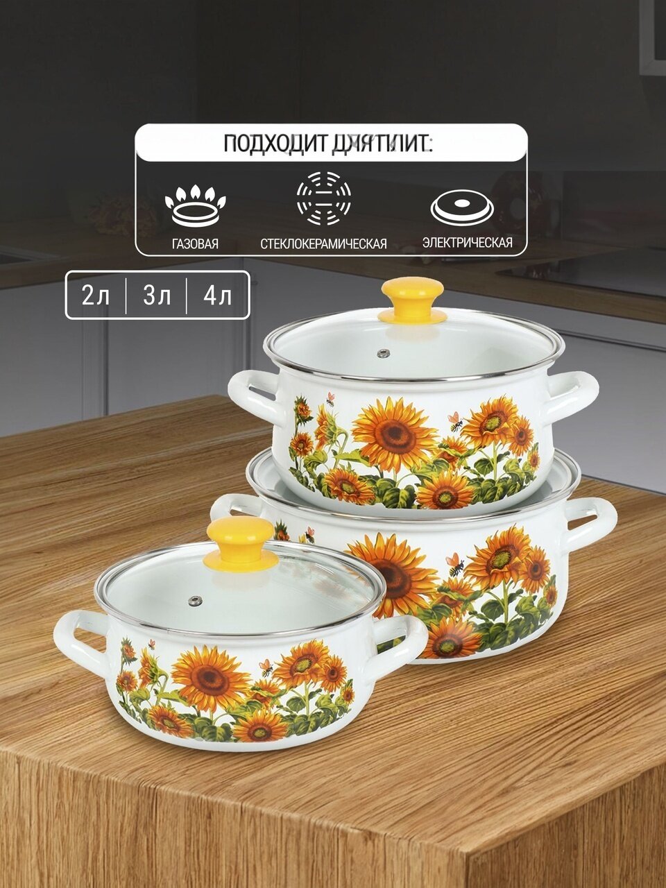 Вы можете приобрести «Набор посуды эмалированная сталь, 3 предмета, кастрюли 2,3,4 л, Керченский металлургический завод, Подсолнечный-1-ЭКСТРА» и другие товары в нашем интернет-магазине в Ельце по низким ценам и с бесплатным самовывозом.