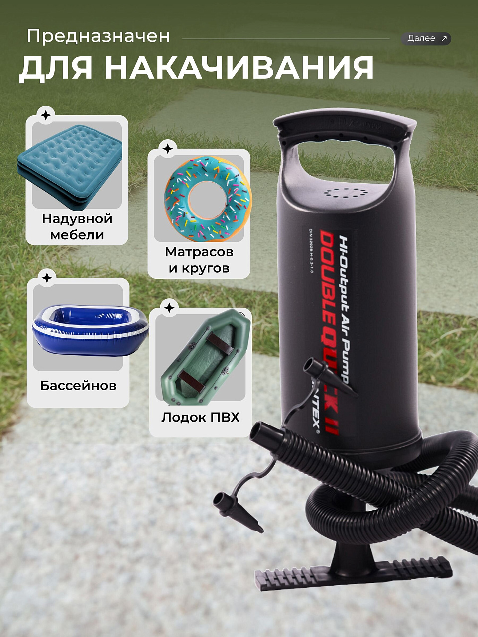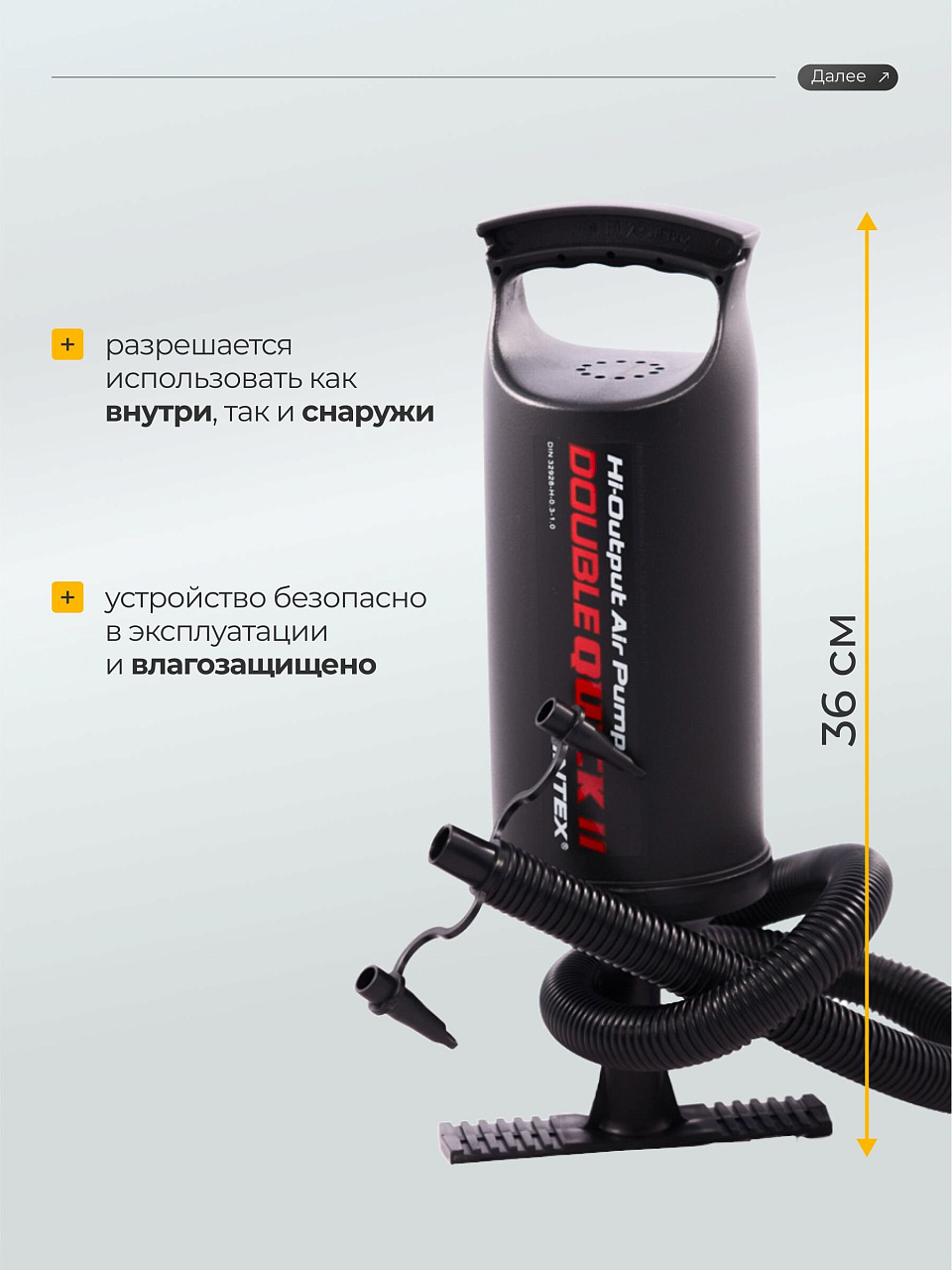 - Обладает системой двойного действия: накачивает надувные изделия как при прямом, так и обратном ходе поршня.