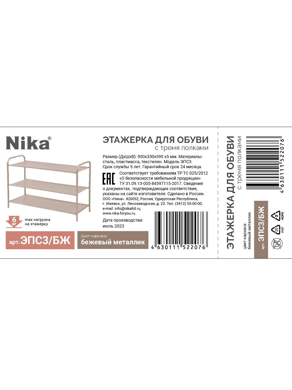 Полка для обуви Nika ЭПС3: компактное хранение до 9 пар, прочная конструкция из металла и текстилена, стильный беж металлик — идеальное решение для порядка в прихожей.