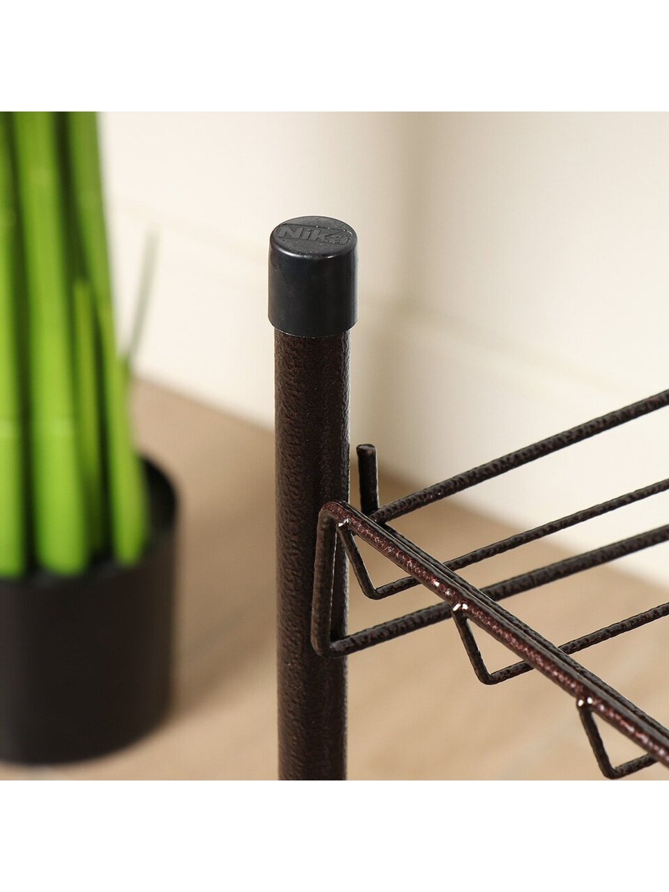 Этажерка НИКА ЭТ1/А – недорогое и удобное в использовании изделие. Максимально допустимая нагрузка – 20 кг. Специальное покрытие защищает конструкцию от возникновения и развития коррозийных процессов из-за соприкосновения с влажной обувью. Включенные в комплект пластиковые колпачки на ножки предохранят напольное покрытие от царапин и придадут всей конструкции большую устойчивость.