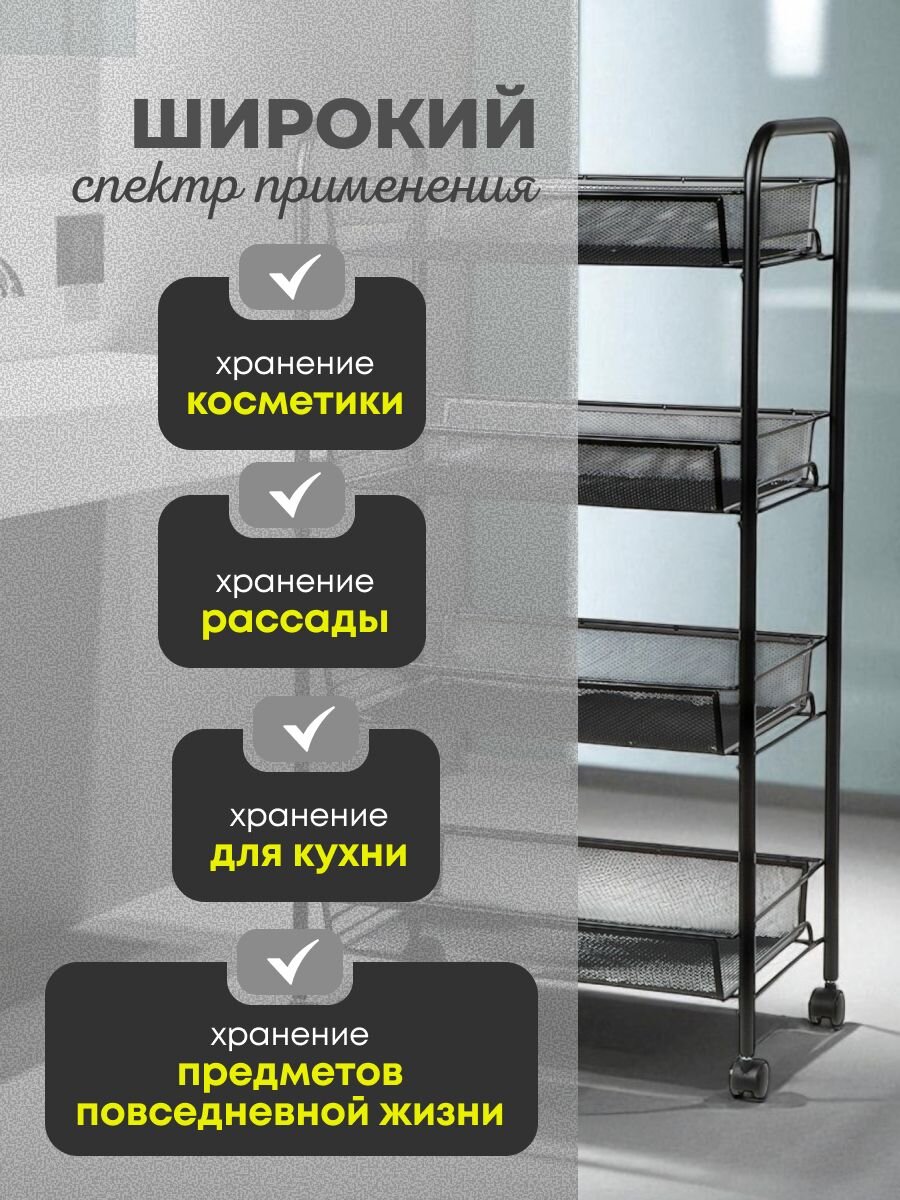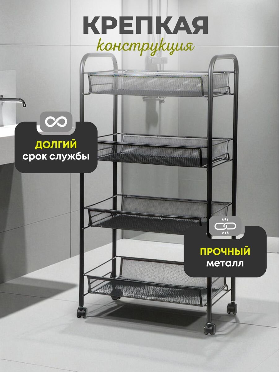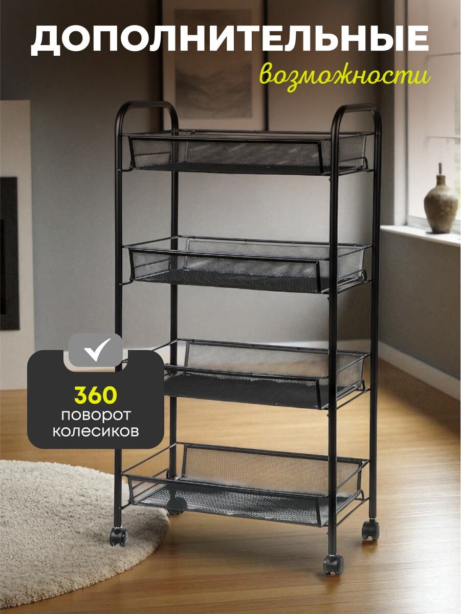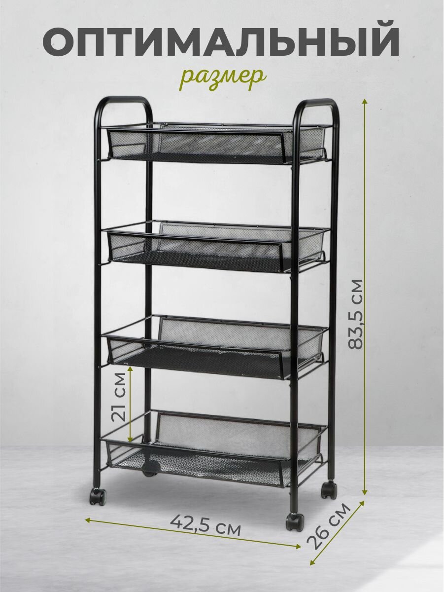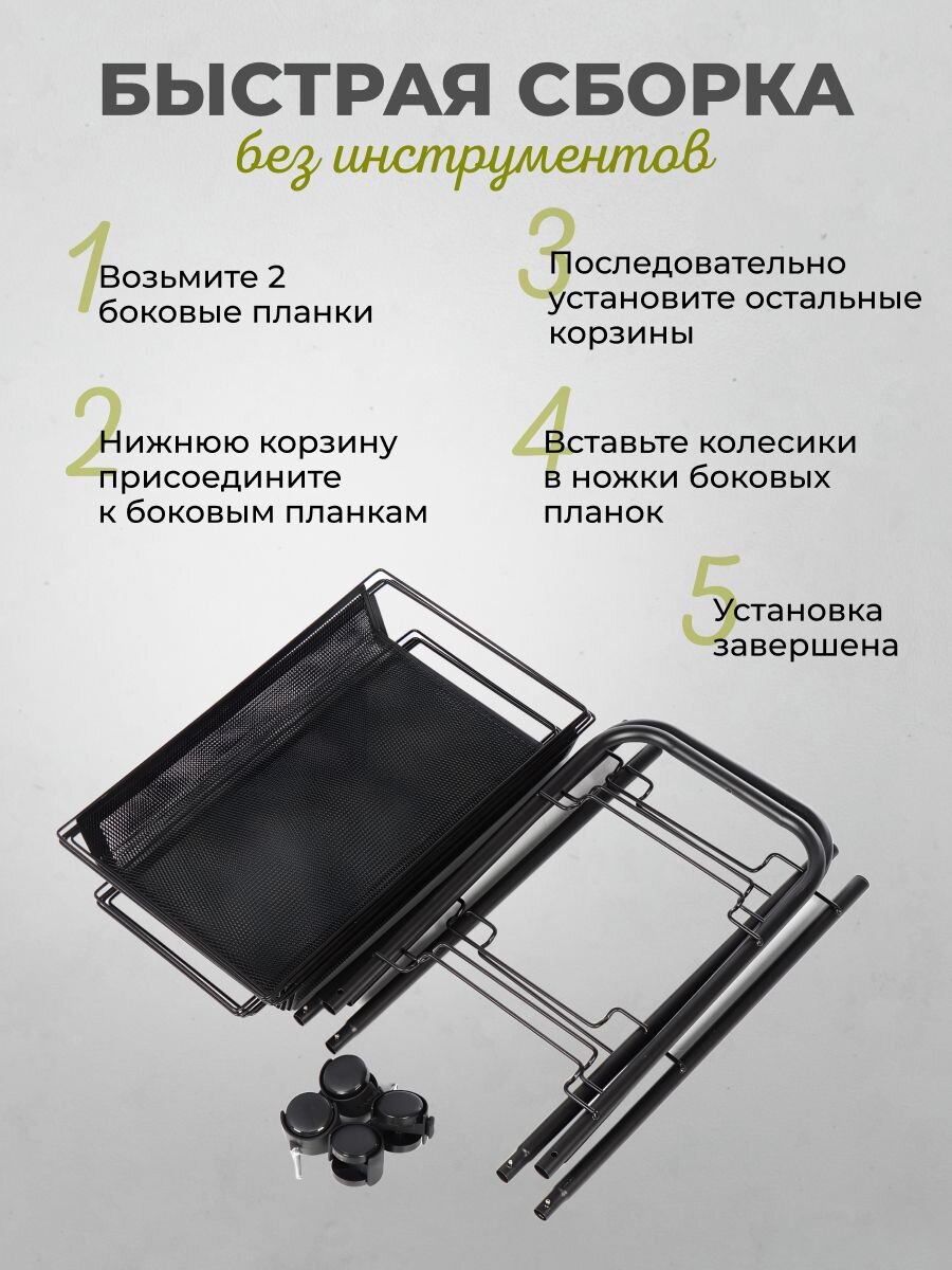 Этажерка LD01-628-1 не только помогает организовать пространство, но и экономит ваше время, избавляя от хаоса и беспорядка. Благодаря своей мобильности и универсальности, она может быть использована в различных комнатах: от кухни до ванной, от гостиной до кладовой. Прочная стальная конструкция гарантирует долгий срок службы, а стильный черный цвет делает ее отличным дополнением к современному интерьеру. Использование этой этажерки позволяет оптимизировать пространство, облегчая доступ к необходимым вещам и поддерживая чистоту и порядок в вашем доме.