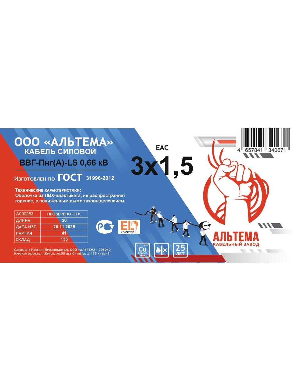 Выбирайте кабель ВВГ-Пнг(А)-LS 3х1.5 мм², 20 м от бренда Альтема — это ваш вклад в безопасность и надежность электросети. Закажите прямо сейчас с быстрой доставкой и гарантиями соответствия ГОСТ!