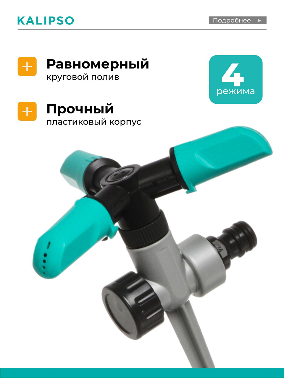 Разбрызгиватель 4 режима Kalipso DY1014Z — идеальное решение для эффективного полива газона или огорода. Современная роторная конструкция с тремя лепестками и цинковым наконечником обеспечивает равномерное орошение участка площадью до 125 м². Импульсный механизм, регулировка давления и выбор одного из четырех режимов позволяют легко адаптировать полив под любые задачи. Быстросъемное соединение экономит время на установку, а прочный пластик гарантирует долговечность.